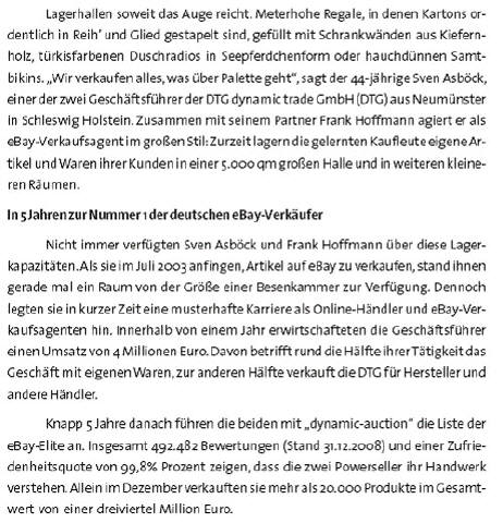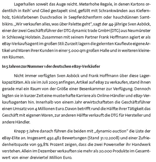 Von Null auf Platin in einem Jahr Lagerhallen soweit das Auge reicht. Meterhohe Regale, in denen Kartons ordentlich in Reih und Glied gestapelt sind, gefüllt mit Schrankwänden aus Kiefernholz, türkisfarbenen Duschradios in Seepferdchenform oder hauchdünnen Samtbikins. „Wir verkaufen alles, was über Palette geht“, sagt der 42-jährige Sven Asböck, einer der zwei Geschäftsführer der DTG dynamic trade GmbH (DTG) aus Neumünster in Schleswig Holstein. Zusammen mit seinem Partner Frank Hoffmann agiert er als eBay-Verkaufsagent im großen Stil: Zurzeit lagern die gelernten Kaufleute eigene Artikel und Waren ihrer Kunden in einer 8.000 m2 großen Halle und in weiteren kleineren Räumen. Doch damit ist der Stauraum, den das Gewerbegebiet an der Saalestraße hergibt, noch lange nicht ausgereizt. „Wenn nötig, dann können wir eine Gesamtfläche von rund 70.000 m2 nutzen“, sagt der 37-jährige Frank Hoffmann – eine Fläche, die ungefähr so groß ist wie zehn Fußballfelder. „Möchte ein Kunde mal eben 600 Waschmaschinen liefern, dann haben wir dafür locker Platz.“ eBay-Karriere im atemberaubenden Klicktempo Nicht immer verfügten Sven Asböck und Frank Hoffmann über diese Lagerkapazitäten. Als sie im Juli 2003 in Kooperation mit der DHL anfingen, Artikel auf dem weltweiten Online-Marktplatz (www.ebay.de) zu verkaufen, stand ihnen gerade mal ein Raum von der Größe einer Besenkammer zur Verfügung. Dennoch legten sie in kurzer Zeit eine musterhafte Karriere als Online-Händler und eBay-Verkaufsagenten hin. Kein Wunder, als ehemalige Mitarbeiter des Versandhauses Oppermann verfügten die beiden von der ersten Online-Transaktion an über hilfreiche Branchenkenntnisse. Dieses Fachwissen spiegelt auch die Arbeitsteilung des Zweier-Teams wider: Sven Asböck ist für die Beschaffung und Qualitätssicherung der Ware zuständig, Frank Hoffmann für die EDV und den Internetauftritt. Der professionelle Einstieg bei eBay hat sich für die DTG gelohnt: Innerhalb von einem Jahr erwirtschafteten die Geschäftsführer mit ihrem eBay Shop „dynamic-auction“ einen Umsatz von vier Millionen Euro. Davon ist rund die Hälfte Geschäft mit eigenen Waren, zur anderen Hälfte verkauft die DTG für Hersteller und andere Händler. Mittlerweile haben die PowerSeller aus dem Norden Deutschlands den Platinstatus im eBay-PowerSeller-Programm erreicht. Dieses Level erreichen professionelle eBay-Händler, die entweder ein Handelsvolumen von 150.000 Euro pro Monat haben oder innerhalb von vier Wochen 5.000 Artikel verkauft haben. Die DTG ist unter den Top 15 der erfolgreichsten eBay-PowerSeller in Deutschland. Ehemalige Kollegen als Mitarbeiter eingestellt Je erfolgreicher die DTG bei eBay handelte, desto mehr Platz benötigten Sven Asböck und Frank Hoffmann für die gelieferte Ware. Als das Versandunternehmen Oppermann im Jahr 2002 den Betrieb auf dem Gewerbegebiet in Neumünster einstellte, standen viele Räume und Hallen leer. Hoffmann und Asböck waren sofort zur Stelle und übernahmen Büro- und Lagerräume ihres ehemaligen Arbeitgebers. Nach kurzer Zeit konnten sie auch einstigen Kollegen einen neuen Arbeitsplatz bei der DTG anbieten. Heute beschäftigt das junge Unternehmen 16 Mitarbeiter. Im Lager stellen vier Fachkräfte die Lieferungen zusammen. Im Büro arbeiten einige Frauen auf Teilzeitbasis. Mit einem individuellen Arbeitszeitkonto können sie ihre Tätigkeit bei der DTG gut mit ihrem Familienleben vereinbaren: „Gerade im Kundenservice stellen wir gerne Mütter ein, weil sie sehr zuverlässig sind. Sie teilen sich ihre Arbeitszeit selbst ein und fangen beispielsweise an, nachdem sie ihr Kind zur Schule gebracht haben“, sagt Sven Asböck. Dieses gegenseitige Verständnis geht auf. Es gebe sehr wenige Ausfälle, so der Geschäftsführer. eBay als Nine-to-Five-Job Nach der aufregenden Gründerzeit ist in Neumünster mittlerweile professionelle Ruhe eingekehrt. Sven Asböck und Frank Hoffmann gehen einem geregelten Nine-to-Five-Job nach, machen zwei Wochen am Stück mit ihren Familien Urlaub und haben sich mit Großkunden aus Industrie und Handel eine Existenz aufgebaut. Die Zeiten, in denen sie auf Partys von Bekannten mit Fragen zu eBay und ihrer Tätigkeit als Verkaufsagent bombardiert wurden, sind auch vorbei. „eBay ist jetzt mein ganz normaler Beruf. Wenn ich eingeladen bin, kann ich wieder über Fußball reden“, lächelt Frank Hoffmann. Auch sein Geschäftspartner Sven Asböck ist in der Gegend mittlerweile für seinen Internethandel bekannt. So sprach ihn ein Bauer als potenzieller Neukunde an: „Ey, Sven, du machst doch eBay. Ich hätte da noch 18 Hektar Land, kannst du das für mich verkaufen?“ Vielleicht ein neues Geschäftsfeld für die DTG – verkaufen ließe sich das Stück Land bei eBay in der Kategorie „Immobilien“. Zukunftspläne Ob Ackerland, elektrische Weidezäune oder Stickständer aus Buchenholz für die Handarbeit – das DTG-Duo verkauft alles, was in einzelnen Posten erworben, im Auftrag von Industrie und Handel im Internet verkauft werden kann und bei eBay erlaubt ist. Die erfolgreichen Verkaufsagenten sind weit davon entfernt, sich auf ihrem Bewertungspolster von über 91.077 Punkten* auszuruhen. Demnächst wollen sie Ausbildungsplätze für die Bereiche Handel und Logistik anbieten. Sie engagieren sich in einem neu gegründeten Verband der Online-Händler und planen in Richtung Ausland zu expandieren. „Du kannst an dem eBay-Geschäft nur gewinnen“, sagt Frank Hoffmann. Bei allen Ideen und Plänen halten die DTG-Gründer jedoch an ihrer Geschäftsstrategie fest: Sie werden auch weiterhin Artikel wie Flachbildschirme, Heckenscheren oder Nordic-Walking-Stöcke ab einem Euro in ihrem eBay Shop einstellen.